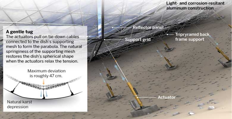 Proje başkanı Nan ve ekibi FAST’ın küresel reflektörünün 300 metre çapındaki bir bölümünü ince parabole çeken ve alıcıları parabölün ekseni boyunca konumlandıran bir sistem tasarladı.