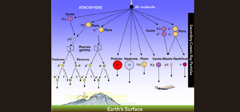 Atmosferle etkileşimleri, ikincil parçacıkların oluşmasına yol açar. Oluşan pionlar; müonlar ve diğer kısa ömürlü parçacıklara bozunur.