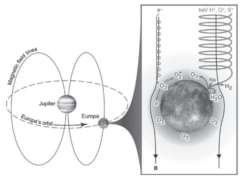 Europa'nın çok ince O2 atmosferi, Europa'nın yüzeyinin güneşin ultraviyole fotonları ve manyetosferik plazma tarafından ışınlanması sonucu oluşur. İyonlaştırıcı radyasyonun oksidan üretimi, Europa'nın olası yer altı okyanusunda yaşam için potansiyel kaynak oluşturabilir.