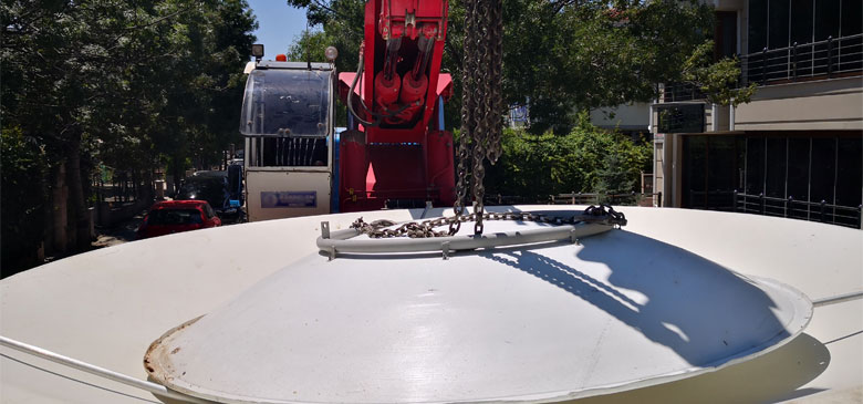 Demonte durumdaki parabolik antenler, güvenlik önlemleri alınarak bulundukları bahçeden motorlu vinç ile dikkatli ve yavaş bir şekilde kaldırıldı.