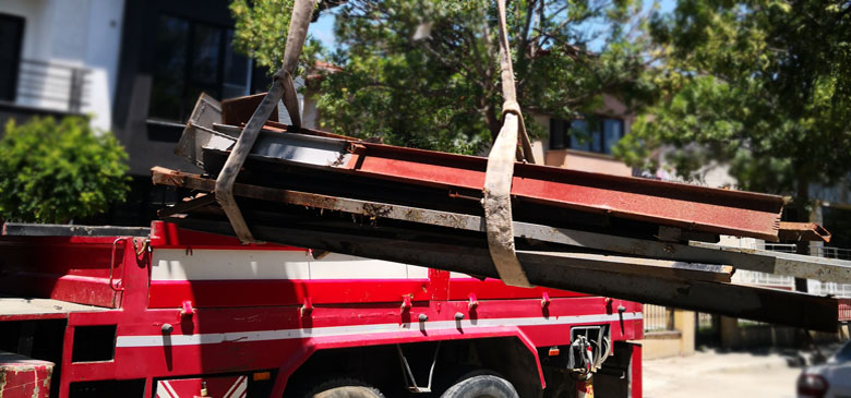 Antenlerin kenarlarının zarar görmemesi adına düz bir şekilde araca yüklenmesinden sonra, çanak sabitleme sistemlerine ait ağır demir parçalar da yine vinçle yerinden kaldırıldı ve taşıyıcı araca yüklendi.